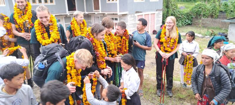 Der abgesprochene Zeitpunkt fürs Frühstück wurde wieder nicht eingehalten, aber die Geburtstagsvorbereitungen für Milan wurden bereits getroffen. Ein paar kleine Geschenke und Geburtstagslieder wirkten unserer Müdigkeit entgegen. Die Wanderung bis zum Lunch war sehr entspannt und die Hitze ließ sich gut aushalten. Auch für unser Abendessen wurde bereits gesorgt, als unsere Begleiter Hühner für das angekündigte Curry kauften und diese uns nun auch begleiteten🐔🍗. Kurz vor unserer Ankunft wurde noch schnell für eine Abkühlung gesorgt: Obwohl erst nur wenig wollten, waren plötzlich doch alle im Fluss baden. Es war eiskalt, aber erfrischend. Doch da wir weder richtige Wechselklamotten noch Handtücher hatten, waren die letzten Minuten unseres Weges nass. Doch all das war vergessen, als wir in Pelmang ankamen, Machhindras Haus sahen und wir unser Ziel nach so vielen Jahren erreichten. Eine herzlichere Begrüßung hätten wir uns nicht vorstellen können. Bilder von uns wurden ausgedruckt, und als jeder mit unendlich vielen Blumenketten begrüßt wurde, waren einige den Tränen nahe. Weiter ging es mit der Zimmereinteilung und Lagebesprechung und natürlich dem Realisieren, dass wir nun endlich hier in Pelmang angekommen sind. Wir waren begeistert von der Gastfreundschaft und den vergleichsweise luxuriösen Zimmern.